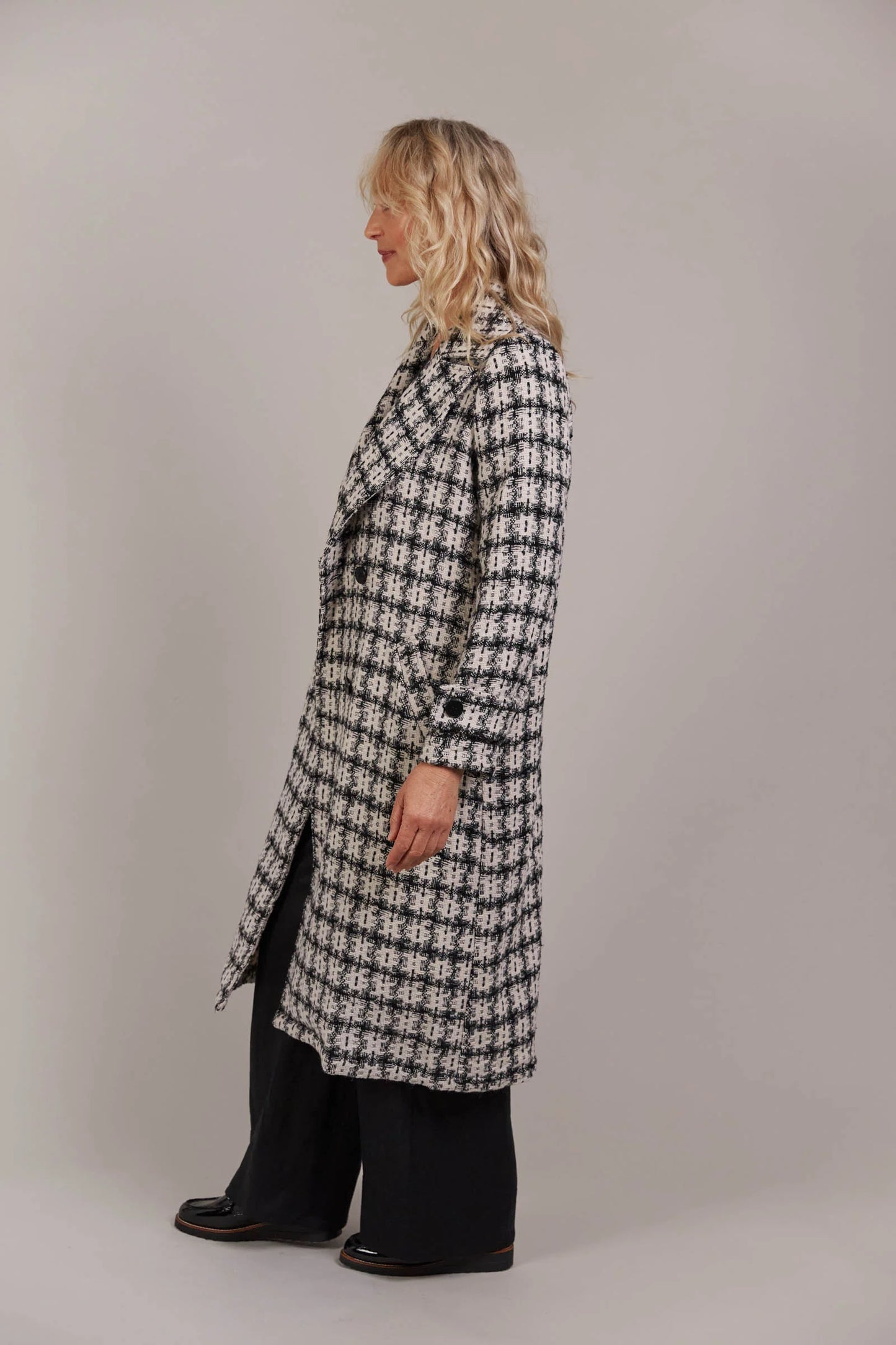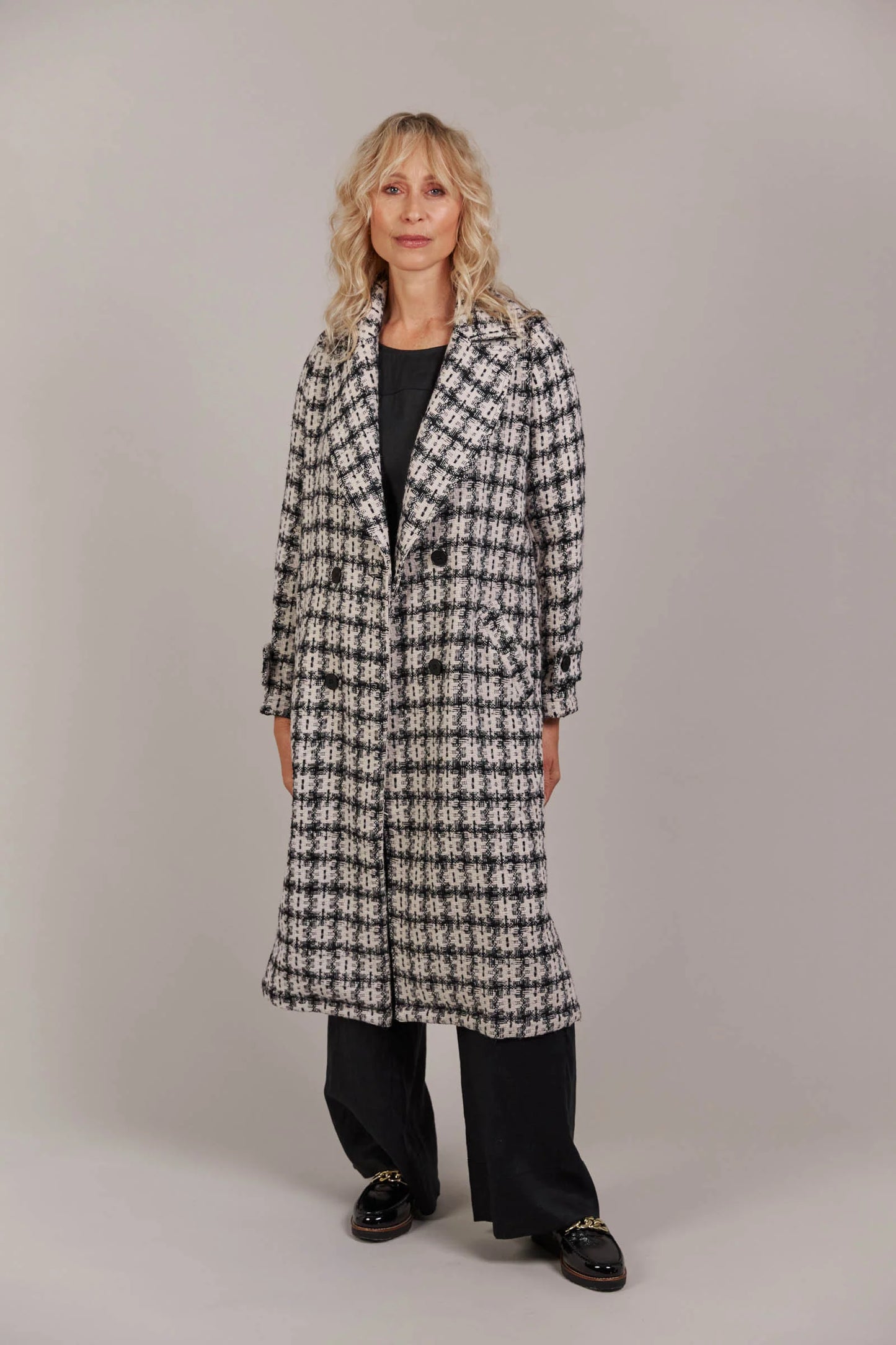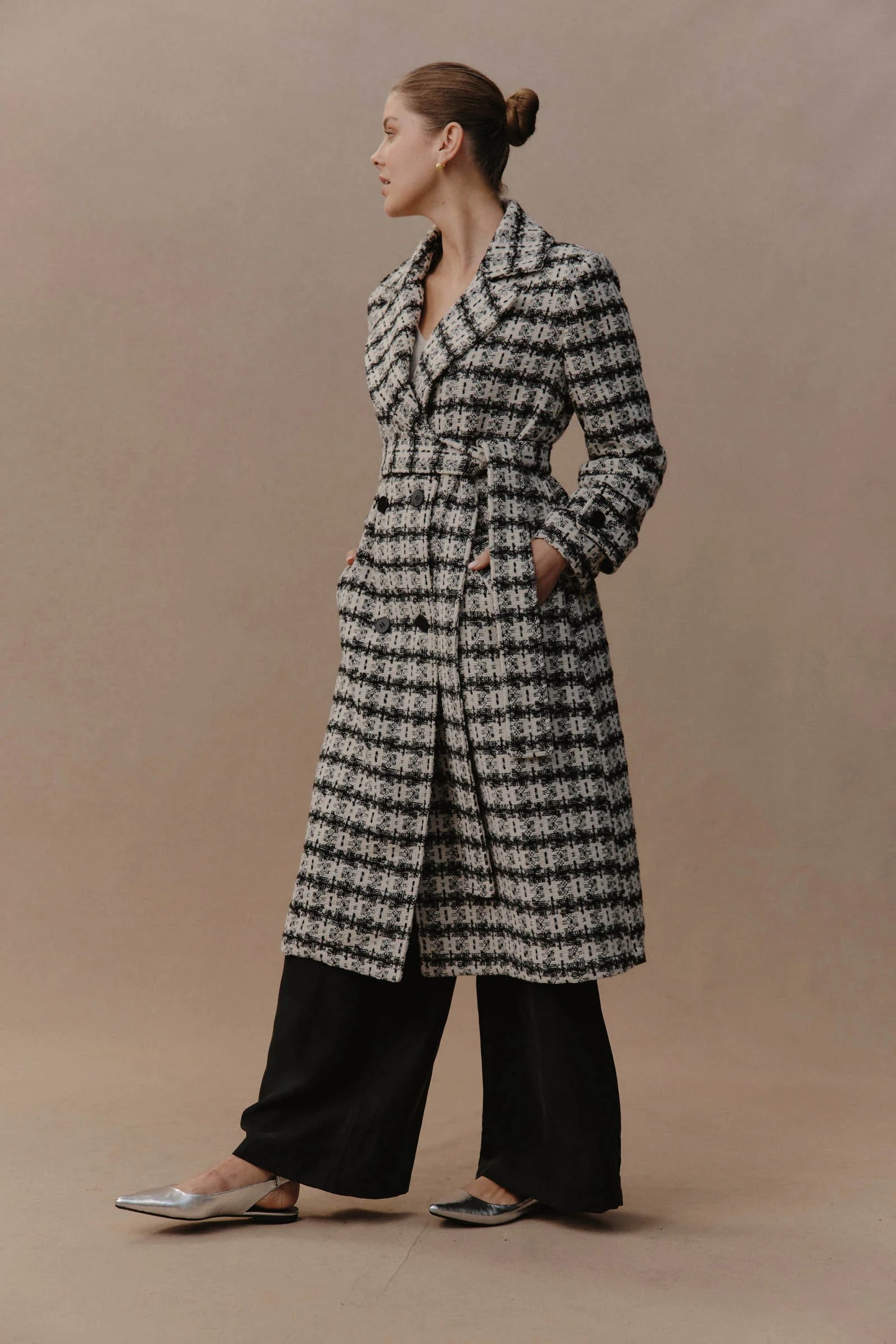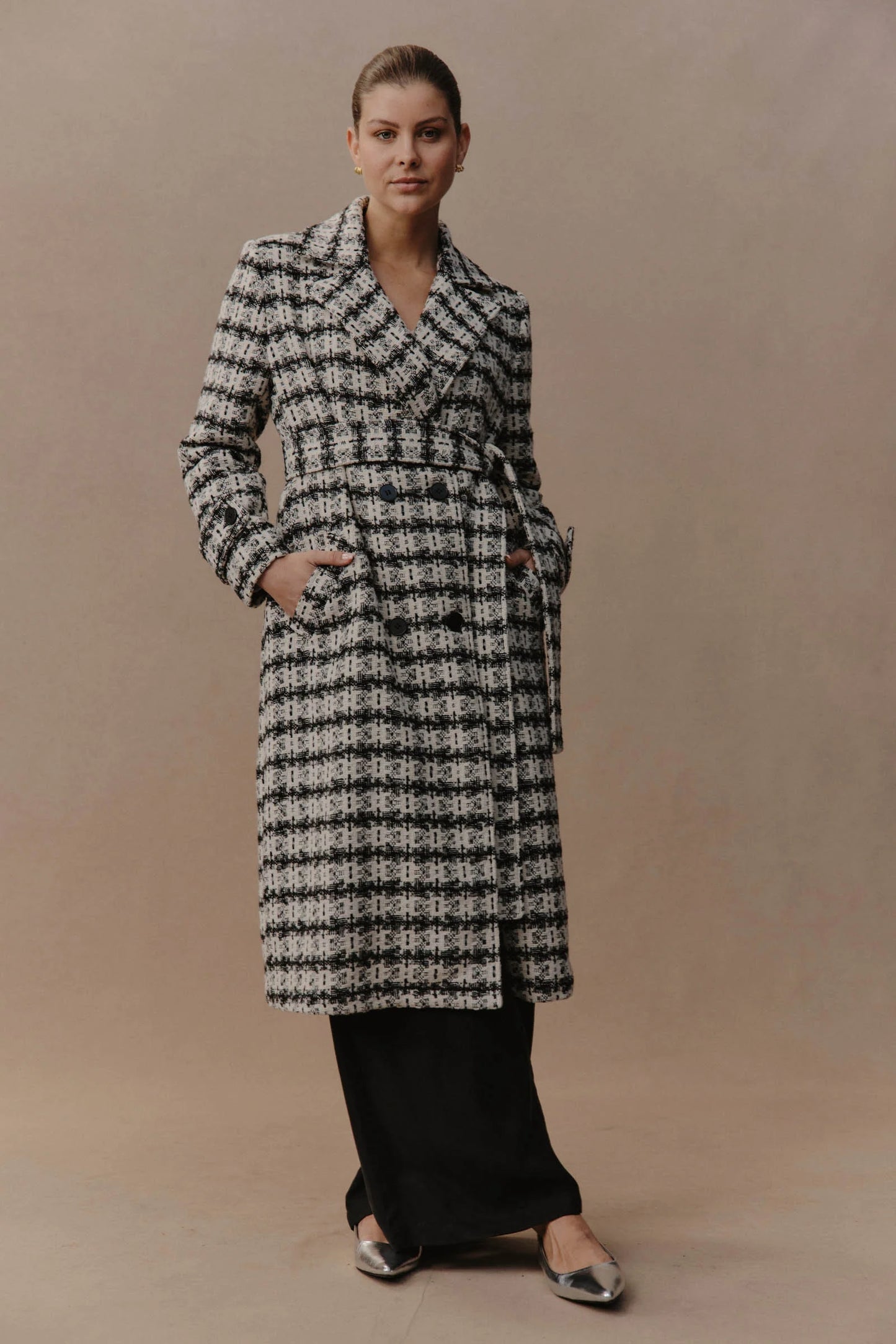 Discover refined winter styling with the Aman Coat, your ultimate companion for a polished, sophisticated look. With its traditional lapel and double-breasted design, this coat offers a classic touch, while the checkered pattern infuses it with a charming, contemporary vibe. A removable self-fabric belt lets you tailor the fit. Perfect for everything from urban outings to formal occasions, this coat brings elegance to every moment.