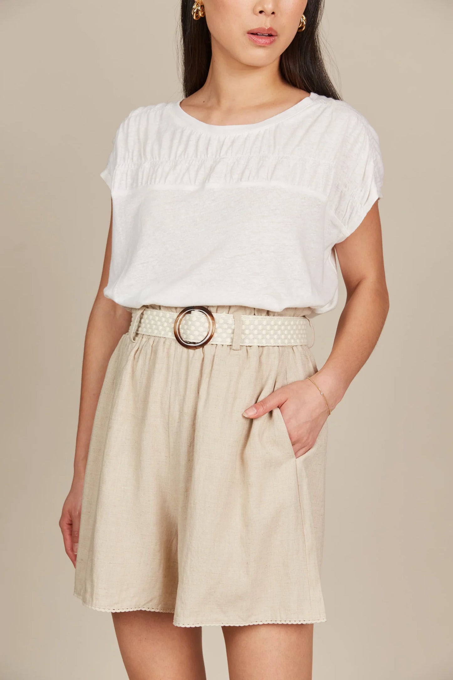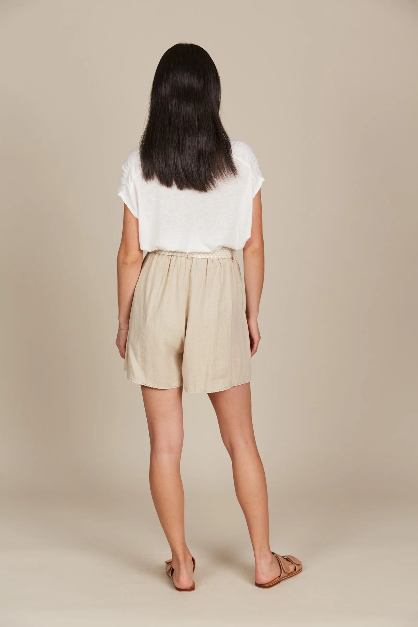 Welcome the sunny season with the fabulous Amelie Short. These high-rise shorts feature a chic contrast belt and delicate trim detailing that adds a touch of sophistication. The elastic waist and loose fit provide all-day comfort, making them a favourite for warm-weather wear. Style them with a blouse, bold accessories, and wedges for a refined and stylish summer outfit.